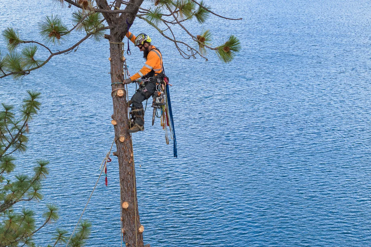 Spurless climbing refers to a method of ascending without the use of metal spikes or spurs that can damage the tree’s bark and cambium layer and can transmit disease. Our climbers use ropes, friction hitches, cams, mechanical devices and other gear to ascend safely and efficiently while minimizing harm to the tree. This approach is often favored in arboriculture for tree maintenance and care, as it maintains the health and longevity of the tree. Tree spikes should only be used for tree removal.